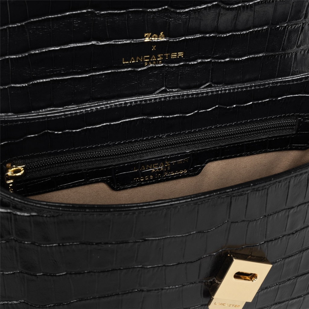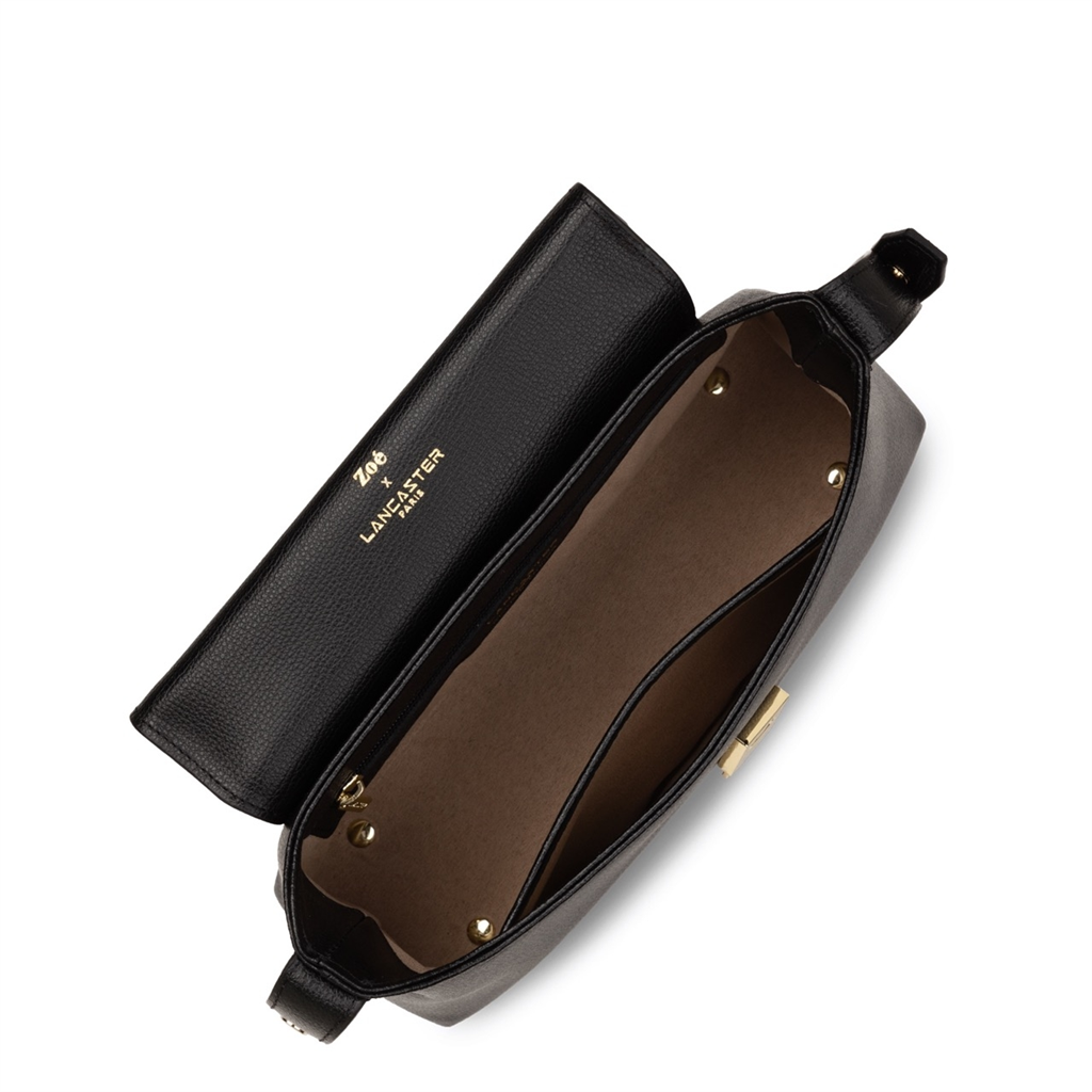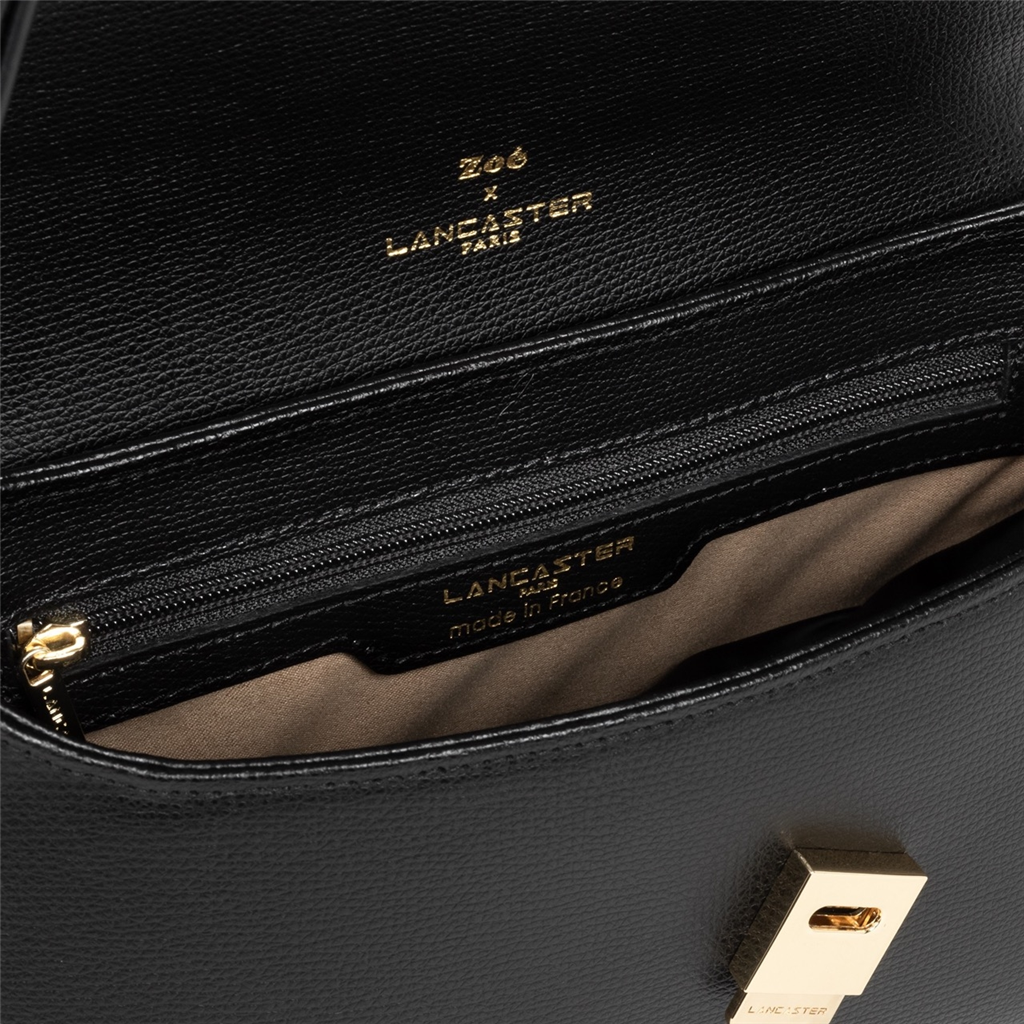 La maison Lancaster et la créatrice de contenu JusteZoé ont collaboré ensemble pour créer une collection qui mélange des touches sucrées et ambiance décalée. Présenté dans sa version Sac à main, il est fabriqué en Italie et confectionné en cuir de vachette grainé. Doté d’un rabat graphique avec fermoir, d’une bandoulière amovible, de 4 pieds en métal, d’une poche plaquée au dos et d’un compartiment principal avec une poche plaquée et une poche zippée. Ce modèle transportera vos essentiels de jour comme de nuit. – Matière : 100% Cuir de vachette, Doublure Textile – Origine : Italie – Forme : Sac à main – Taille : TU – Porté : Main, épaule ou croisé – Fermeture : Rabat avec fermoir – Anse : Oui – Bandoulière : Ajustable – Dimensions : L 27 cm x l 8 cm x H 15 cm, Hauteur bandoulière (porté plus court) 62 cm, Hauteur bandoulière (porté plus long) 113 cm – Poids : 0,480 kg – Référence : 480-012 – Entretien : Nous conseillons d’imperméabilisé votre sac avant utilisation. Nettoyer régulièrement votre sac avec un chiffon doux pour enlever la poussière. Utilisez un chiffon pour la saletés et un lait nourrissant incolore pour cuir pour un nettoyage plus en profondeur. Évitez l’exposition à la lumière, à la chaleur, à l’eau et aux corps gras.