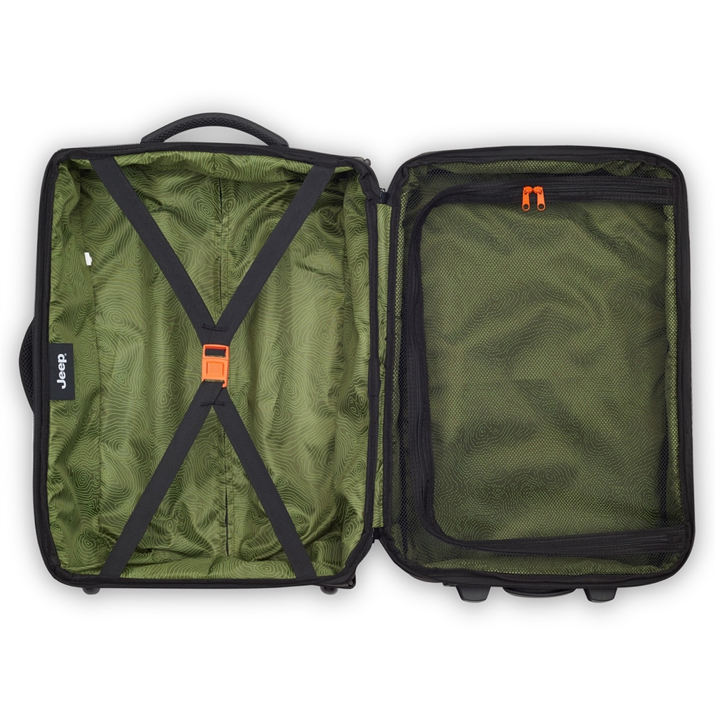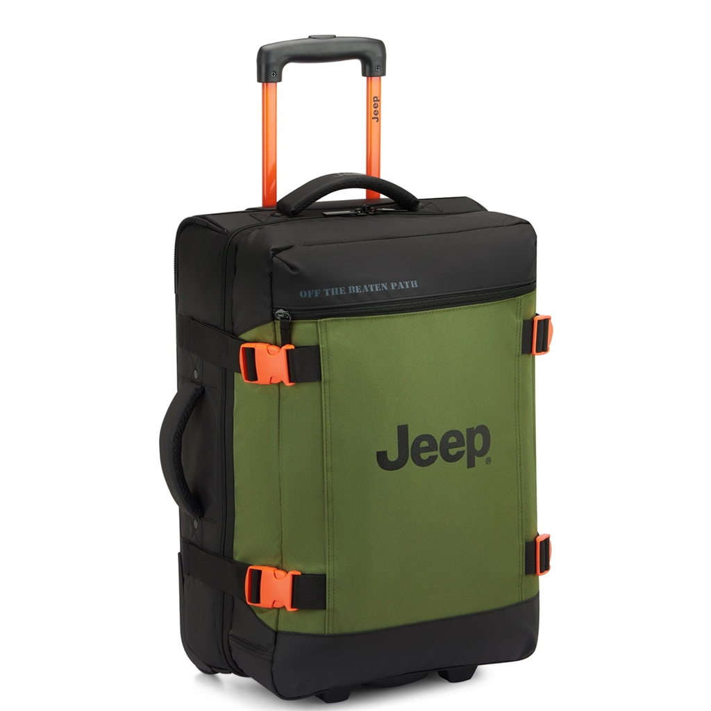 Delsey signe une partenariat avec Jeep et réalise une collection de bagages inspirés des modèles emblématique de la marque automobile. Présentée dans sa version Sac de voyage cabine, elle est idéal pour emmener vos essentiels durant un week-end. Cette collection haut de gamme allie design et fonctionnalité. – Matière : 100% Polyester – Origine : Non communiqué – Modèle : Sac de voyage en toile à 2 roues – Taille : Cabine – Serrure TSA : Non intégrée – Capacité : 37L – Poids : 2,41kg – Poids moyen : Environ 10kg – Dimensions : H 55 cm x L 37 cm x l 24 cm – Référence : J0374021 – Garantie : Garantie mondiale limitée de 2 ans Extérieur – Fermetures : Fermetures à glissière – Poignées : 1 poignée haute, 1 poignée latérale et 1 poignée de traction (Double tube) – Type de roues : 2 Roulettes – Tissu déperlant : Oui – Poche extérieure : 1 poche – Sangles : Détachable et rétractable selon le volume intérieur Intérieur – Compartiment inférieur avec sangles croisées – Compartiment supérieur avec plateau séparateur filet